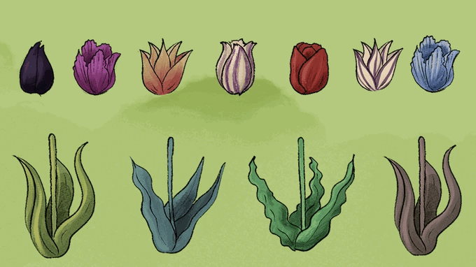 Each Nice Friendly Tulip image in the project contained a random combination of dozens of individually illustrated elements, created by me. So, there were tens of thousands of unique possible combinations.
